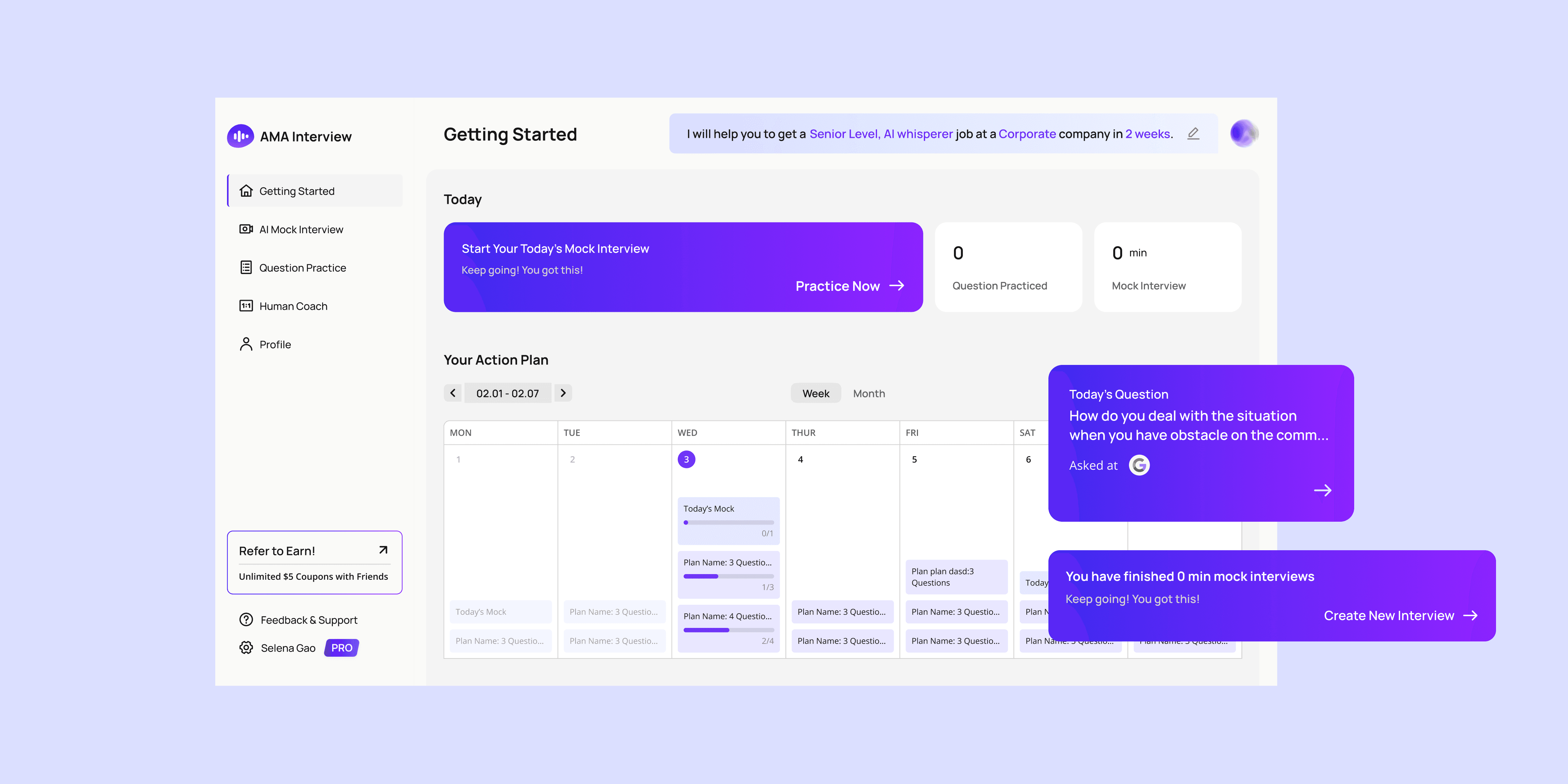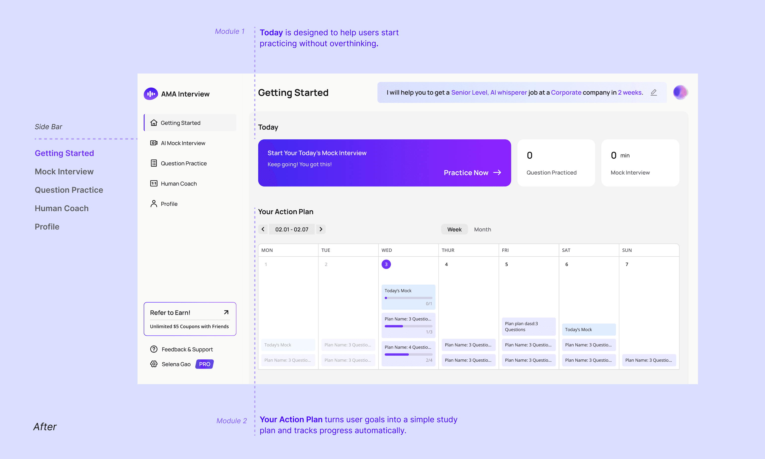 To support this decision, we introduced a dedicated Getting Started experience. Instead of exposing all capabilities upfront, the product now guides users toward a single, high-value action:start a mock interview.
