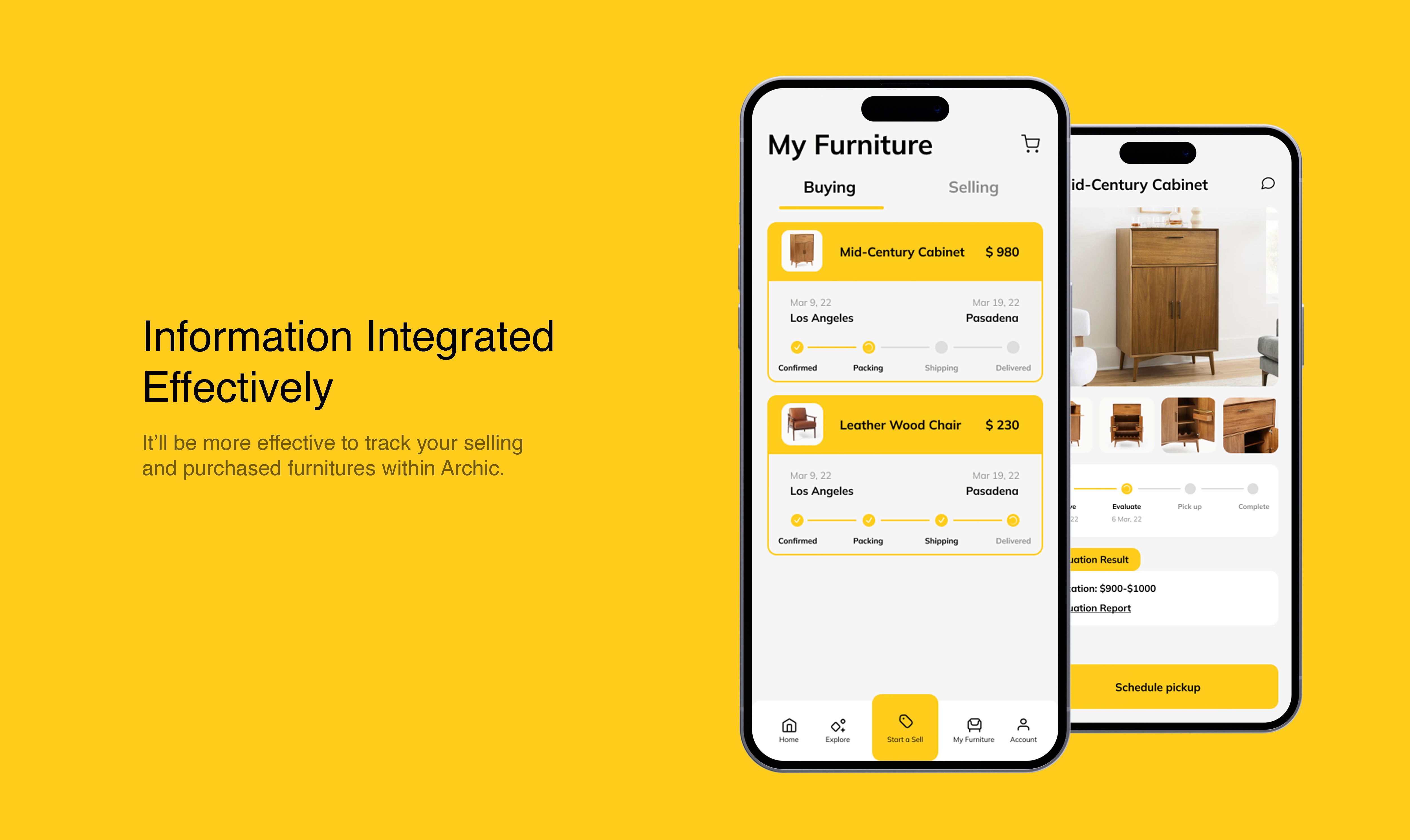 The "My Furniture" section in the app unifies all selling and purchasing information, allowing users to manage transactions and track progress efficiently within Archic.