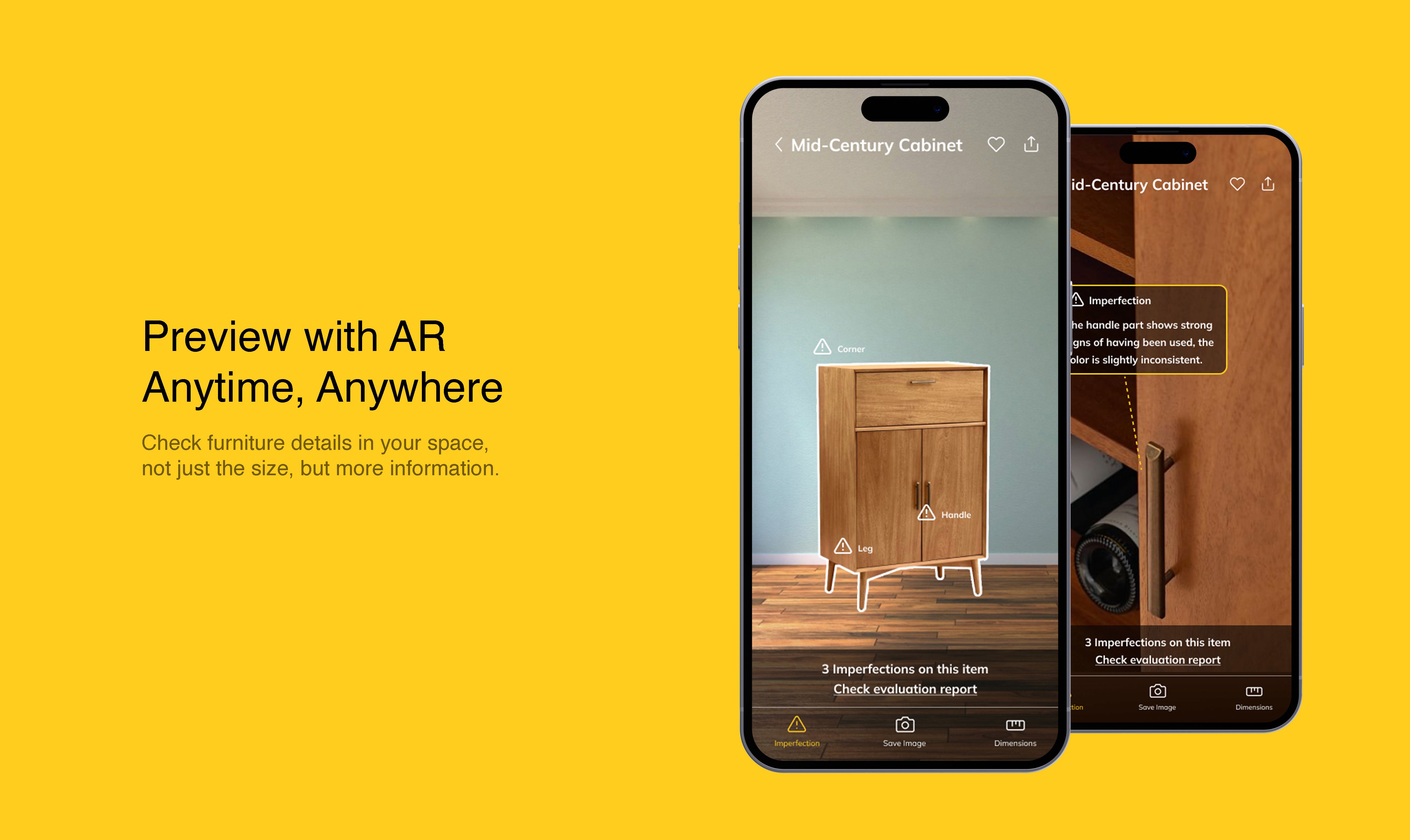 The app's AR preview feature lets users visualize furniture in their space before purchase, examining details and imperfections at various scales for comprehensive quality insights.