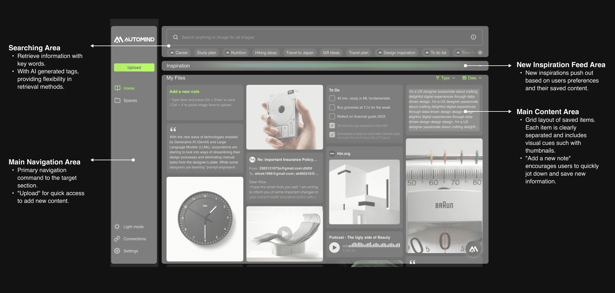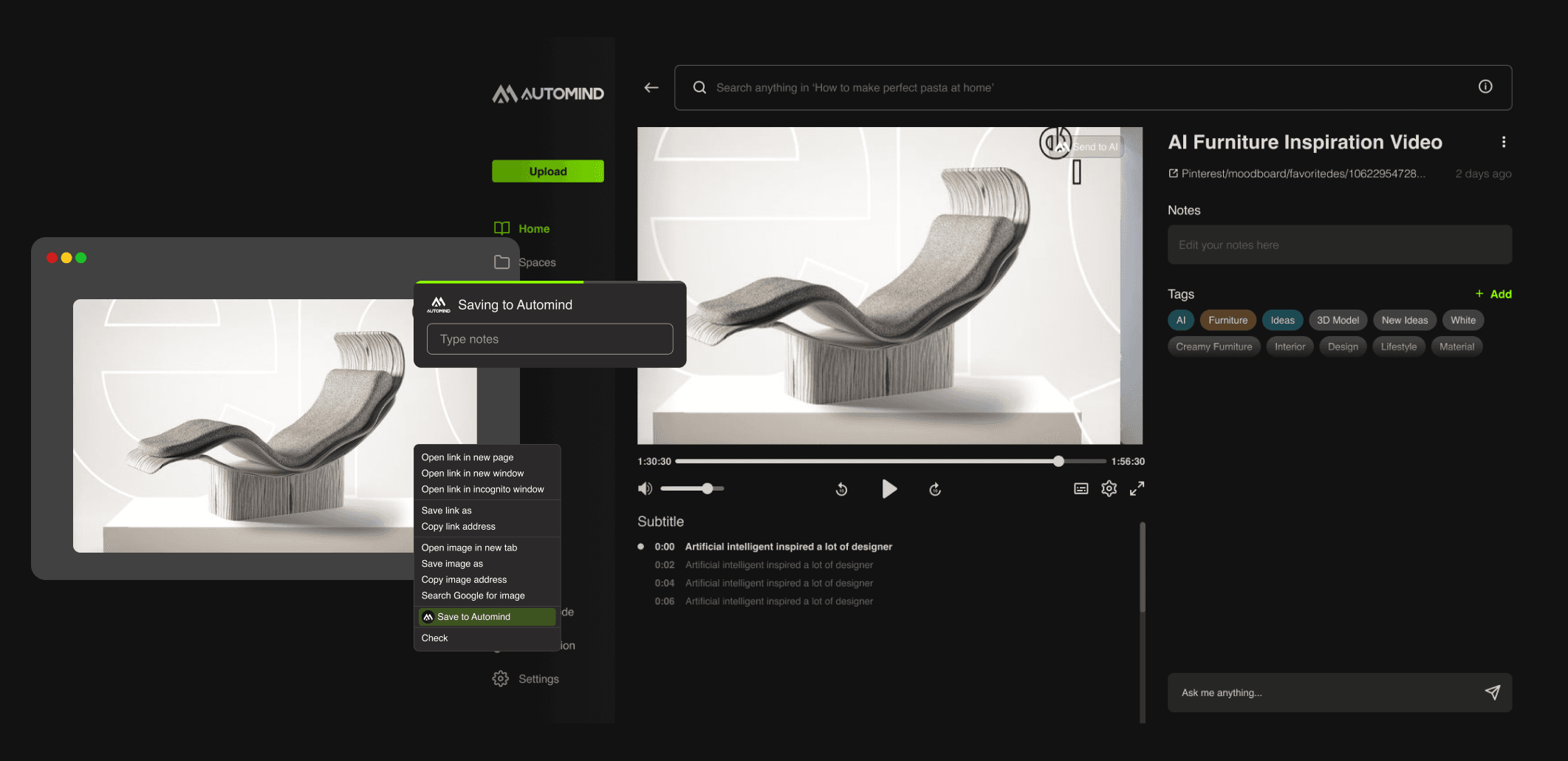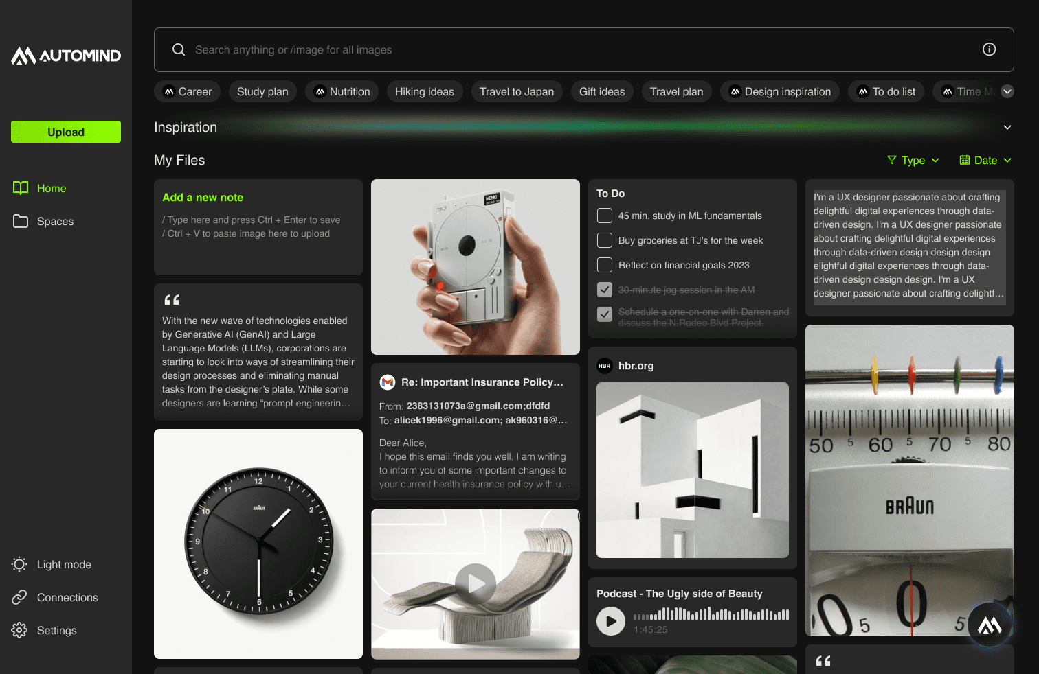 Automind is an AI-powered platform that saves notes, images, inspirations, and highlights, eliminating the need for manual categorization.