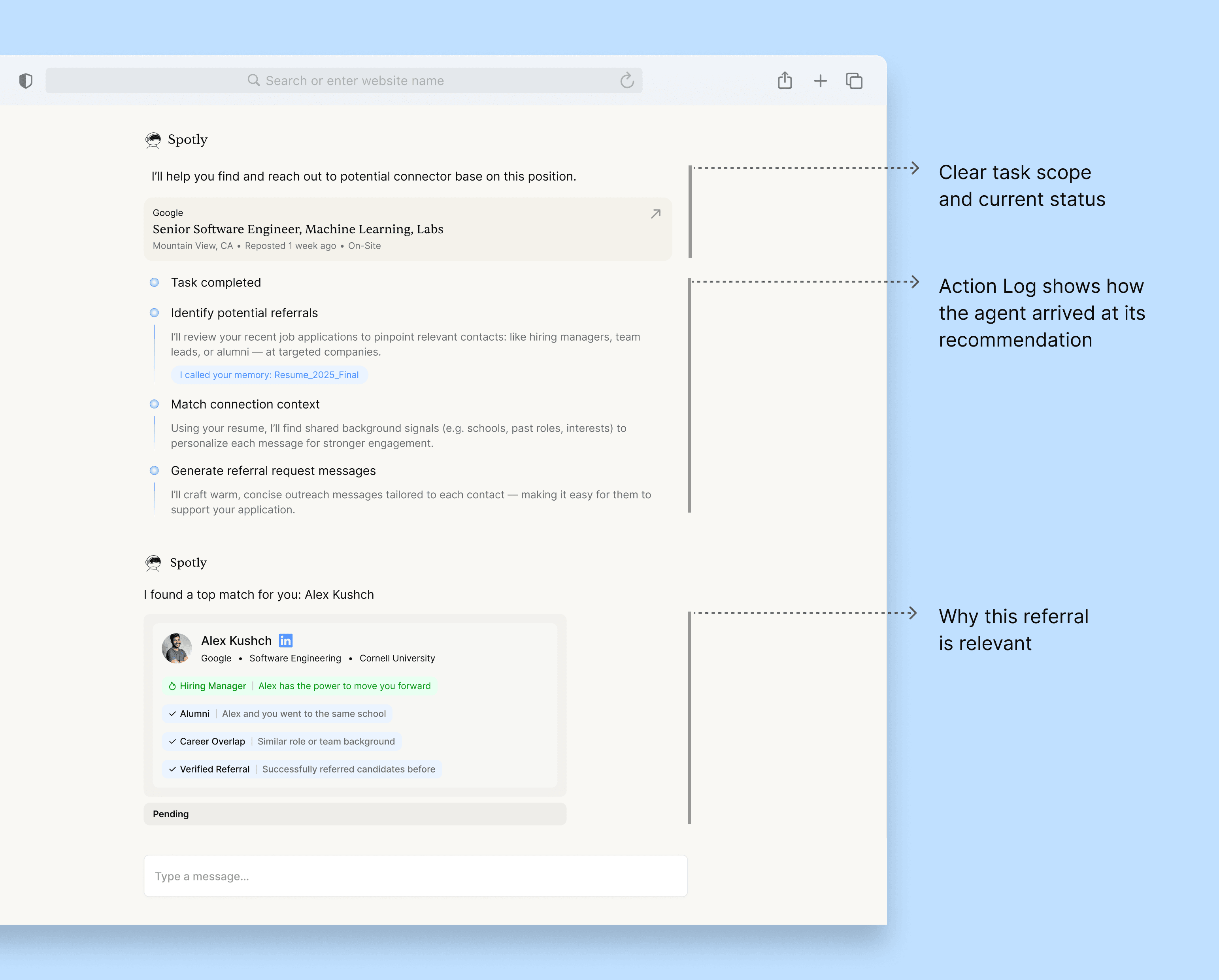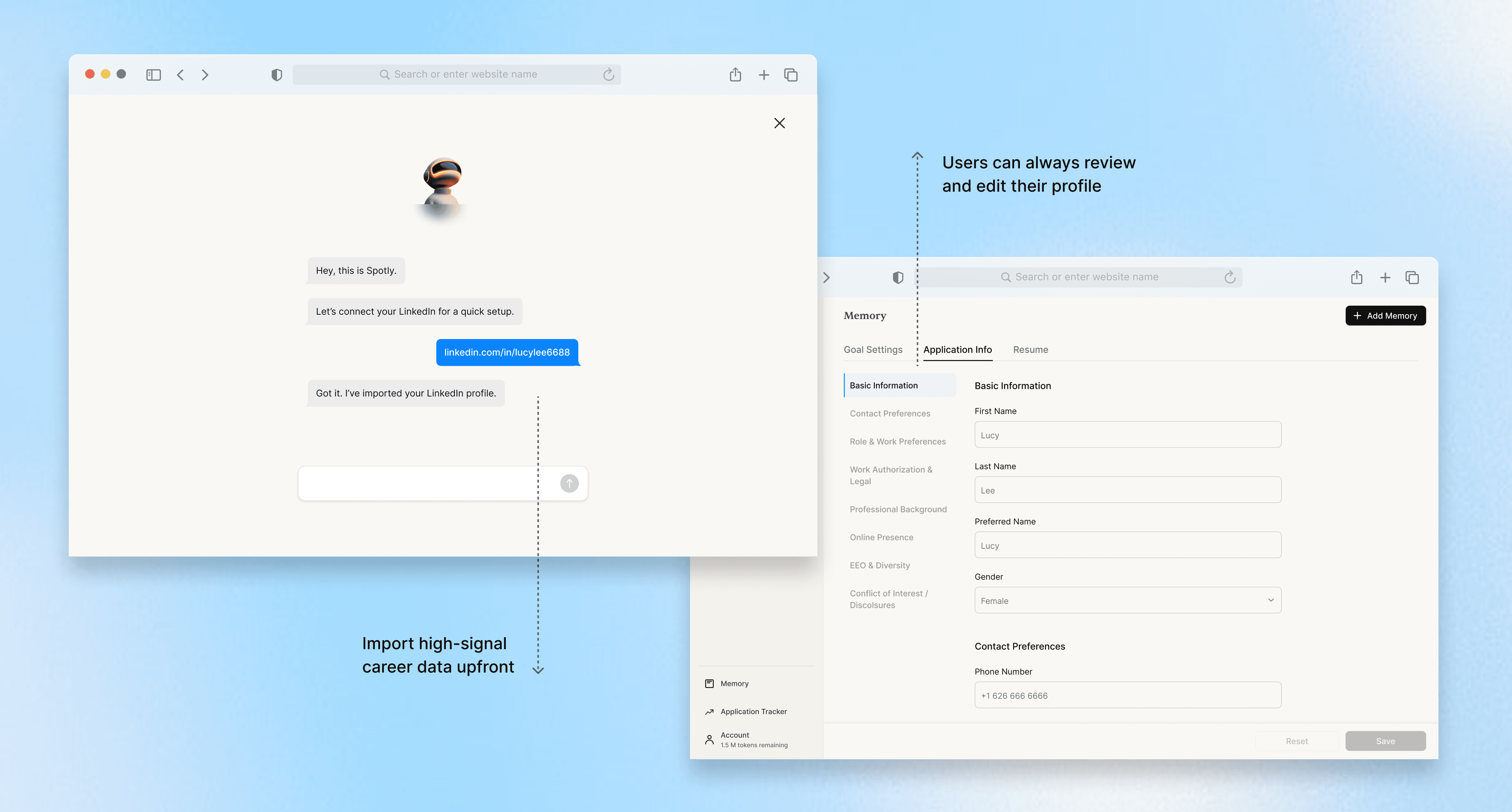 By importing high-signal career information upfront and requesting additional details only at critical moments, Spotly minimizes onboarding friction while ensuring the agent has the right context at the right time.