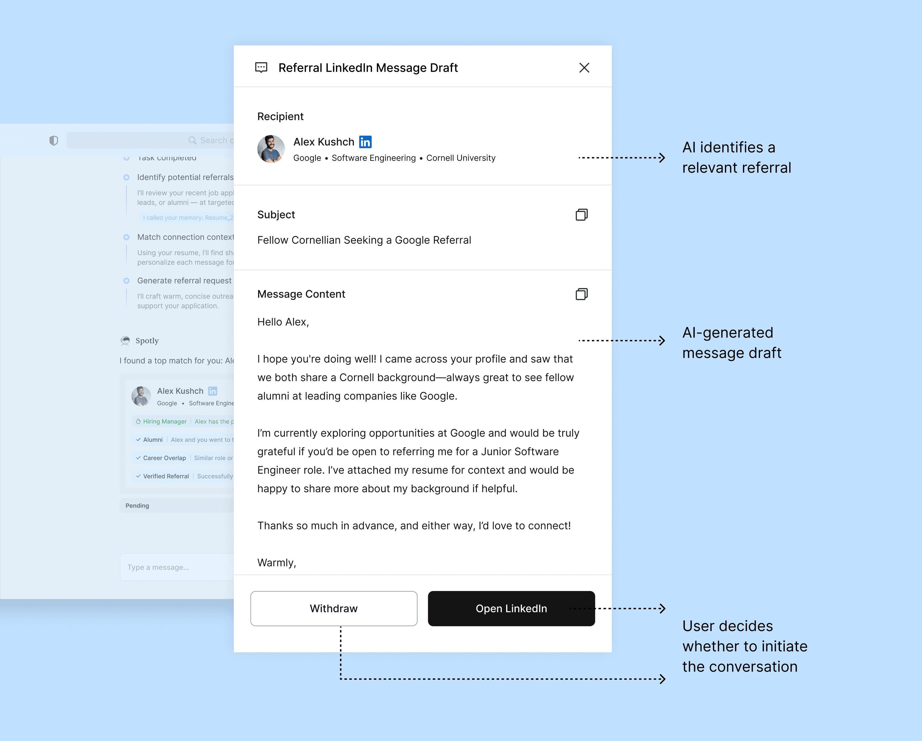 Spotly assists by identifying opportunities and drafting outreach, but leaves the final decision and action to the user—preserving trust in socially sensitive interactions.