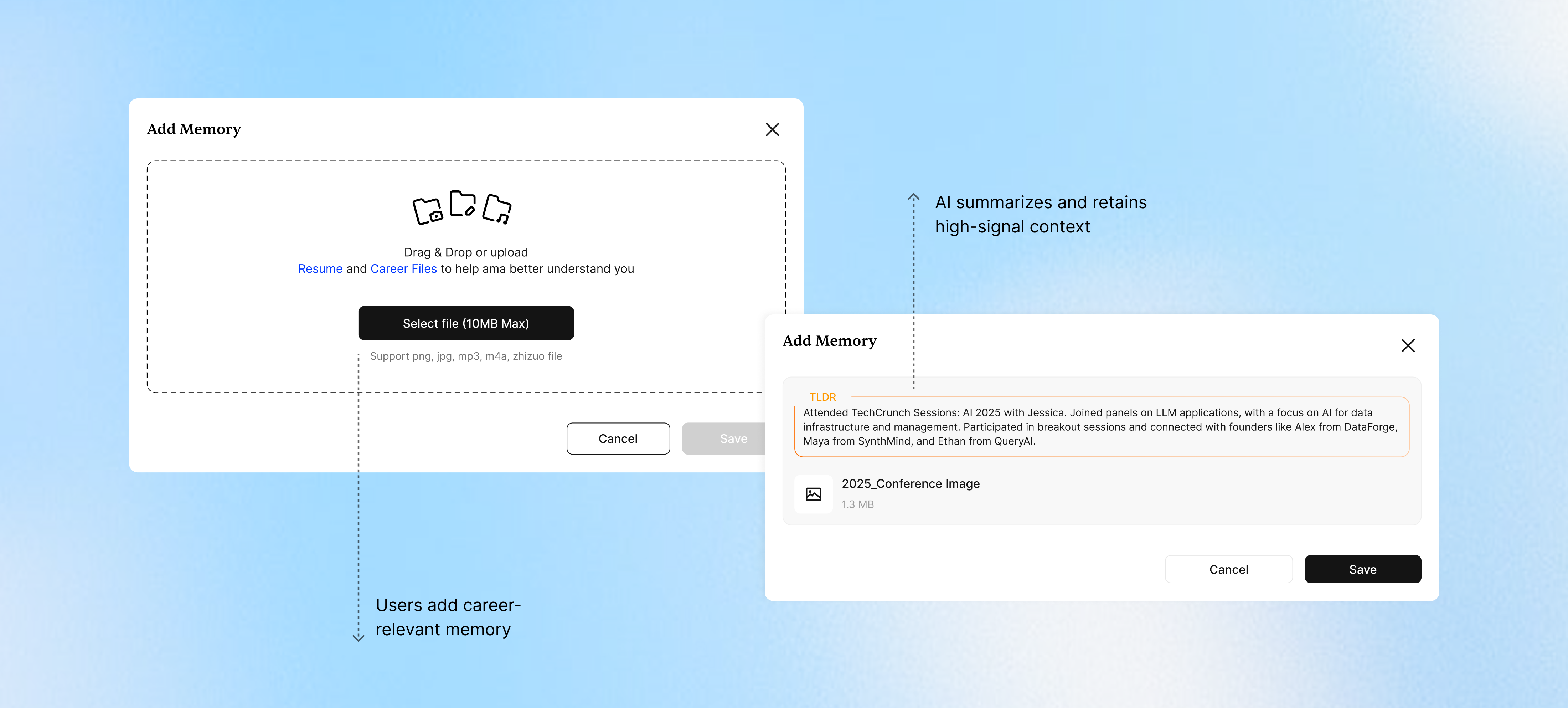 By allowing users to store career-related memories and surfacing AI-generated summaries, the system begins to accumulate context over time—while keeping the current experience lightweight and focused.